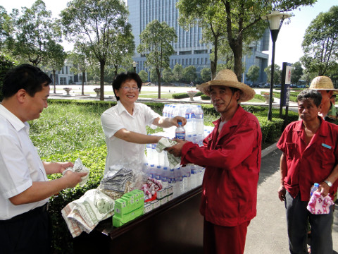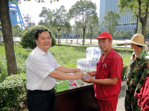 對于常年高溫的洗衣機房,針對蒸汽管溫度過(guò)高問(wèn)題,該隊男職工找來(lái)隔熱材料,將其包裹,有效降低了室內溫度;對于新接手的車(chē)房,針對值班室在車(chē)房外且無(wú)任何降溫設施的情況,項目部領(lǐng)導向礦方爭取了空調,第一時(shí)間安裝到位;對于奮戰在工廣路的清潔工,領(lǐng)導們?yōu)樗麄兯腿チ朔朗罱禍氐乃幤泛褪称,并一再叮囑大家要輪流作業(yè),適當休息,如有不適要立即停下工作或報告班隊長(cháng)。同時(shí),做好內部穩定工作,營(yíng)造團結和諧的工作氛圍,保障職工平安度夏。
