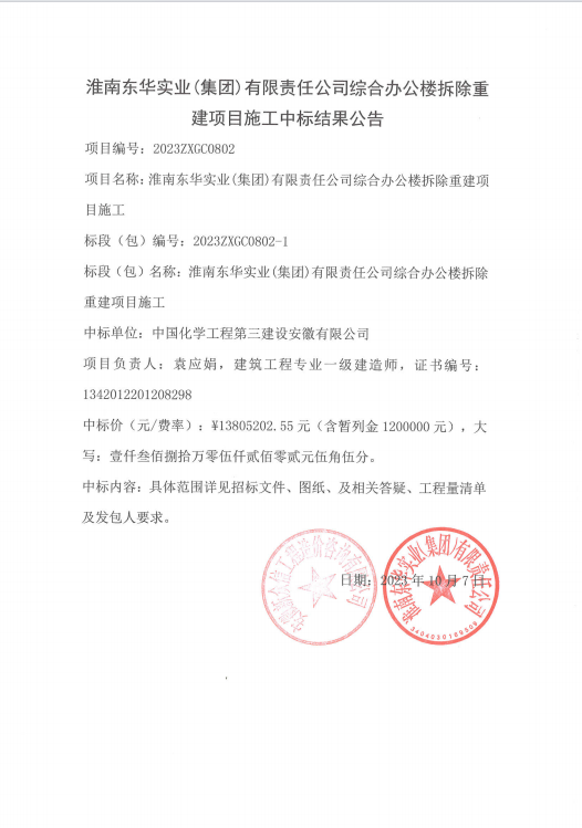 淮南東華實(shí)業(yè)(集團)有限責任公司綜合辦公樓拆除重建項目施工中標結果公告